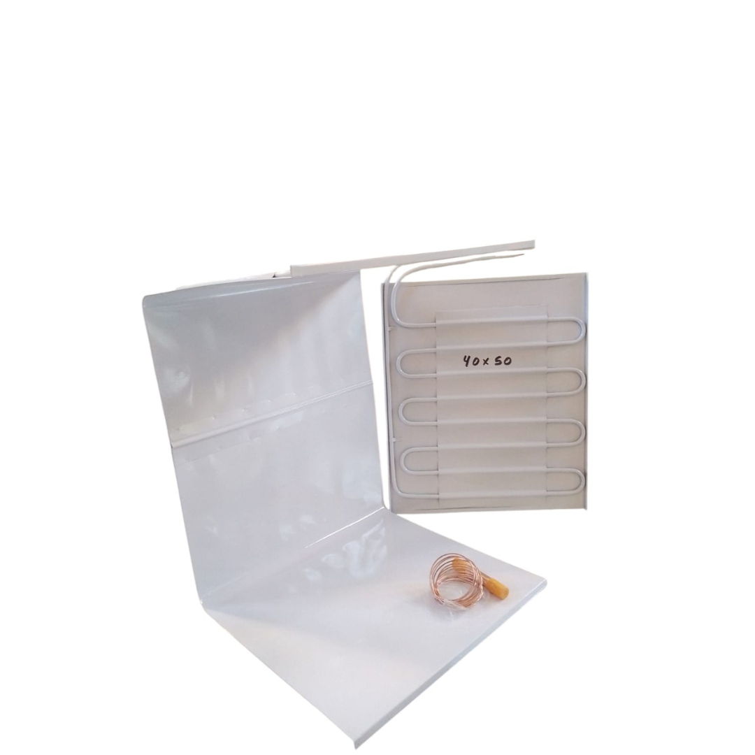 Evaporador de placa para heladeras y freezers, diseñado como repuesto o fabricación a medida. Construido en chapa galvanizada con pintura epoxi termo convertible y capilar de cobre para un enfriamiento eficiente y duradero.