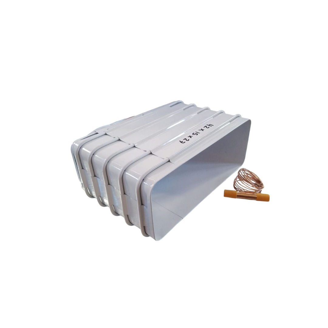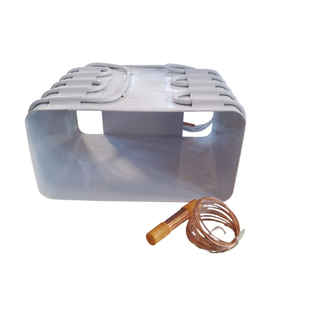Evaporador compacto con serpentín superior, diseñado para heladeras y freezers. Fabricado en chapa galvanizada con pintura epoxi termo convertible y capilar de cobre para una refrigeración eficiente y duradera.